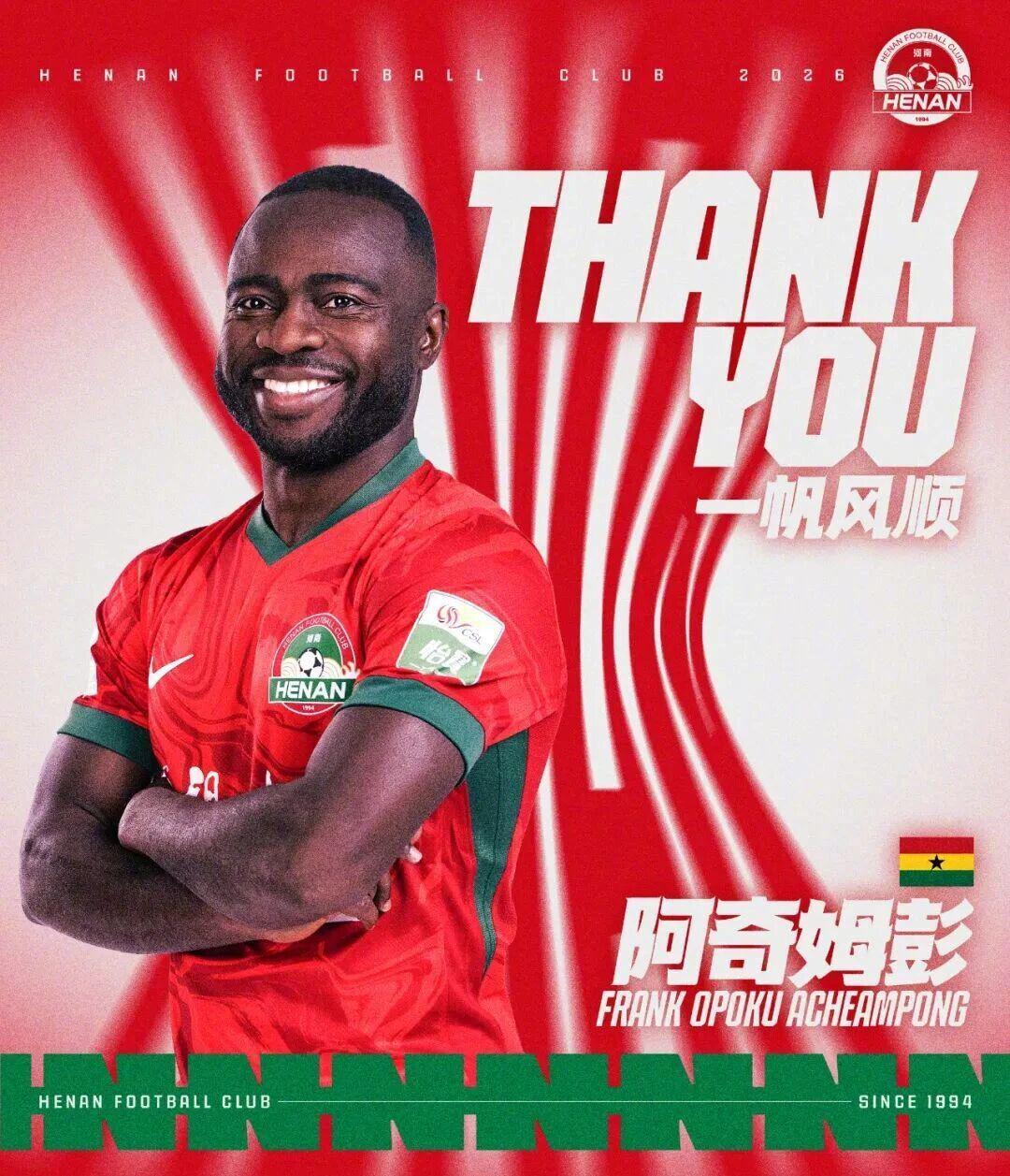 阿奇姆彭自2024赛季加盟河南队,总计代表球队出场59场,攻进18粒进球并送出7次助攻。上个赛季他代表河南队出战34场比赛,攻进15球并送出3次助攻,是球队闯入足协杯的决赛的关键球员之一。此前便有报道传出阿奇姆彭与河南队的续约谈判陷入僵局,最终这位强援无缘继续留队,而其下家目前也暂不清楚,留在中超的可能性似乎正在变得越来越小。